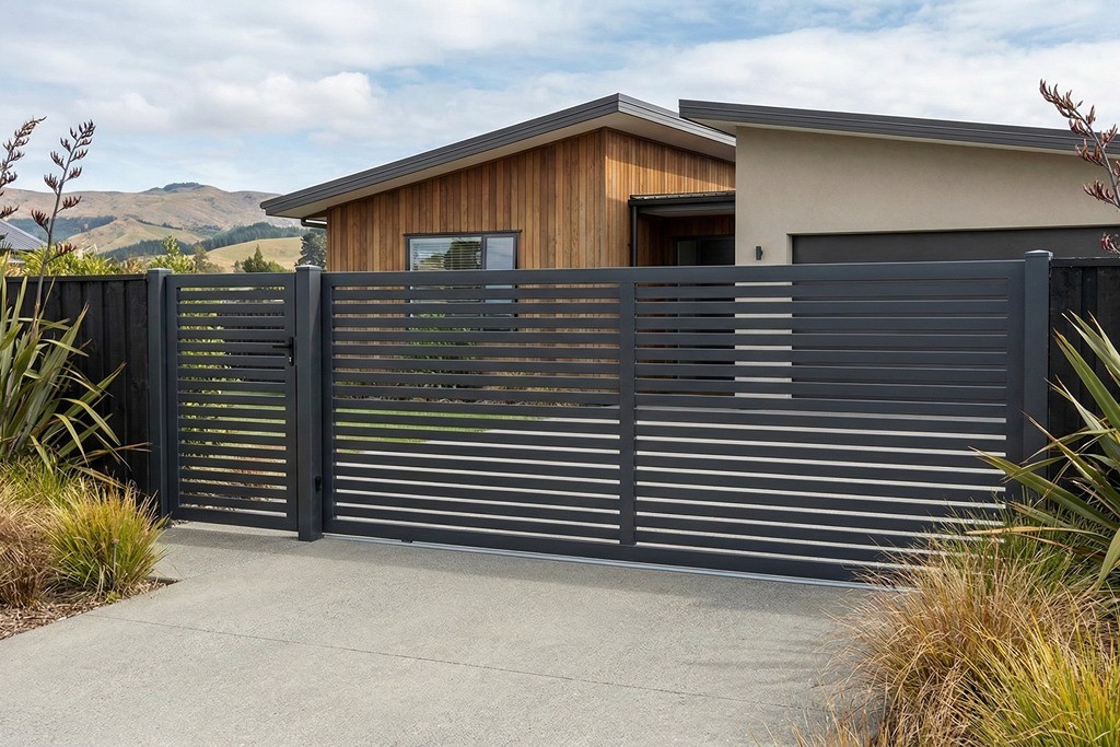 The matching gate to our Sola Horizontal Slat panels. The slat gate is a great option for higher wind areas where looks matter.